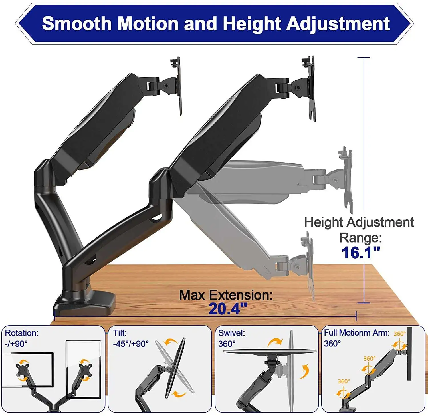 Monitor stand can be installed via C-clamp or Drilled into the desk for quick installation. The arms can be raised or lowered in any direction for easy height adjustment