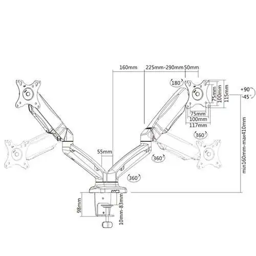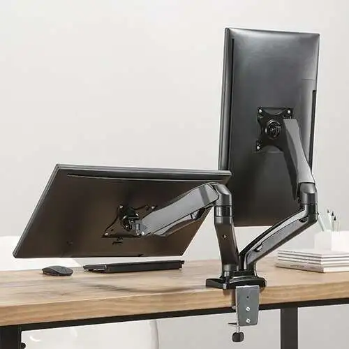 The dual monitor stand has an internal pneumatic spring which adjusts to the weight of your monitors creating a free-floating effect that lets you instantly adjust the height of your monitors without the use of tools. The articulating mount offers +45° to -45° tilt, 90° swivel, and 180° rotation, letting you find the most comfortable viewing angle every time.